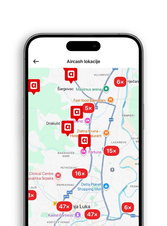 Novac možeš isplatiti na bilo kojem bankomatu sa svojom Aircash Mastercard karticom ili kodom na bankomatima Nove Banke i MF banke.